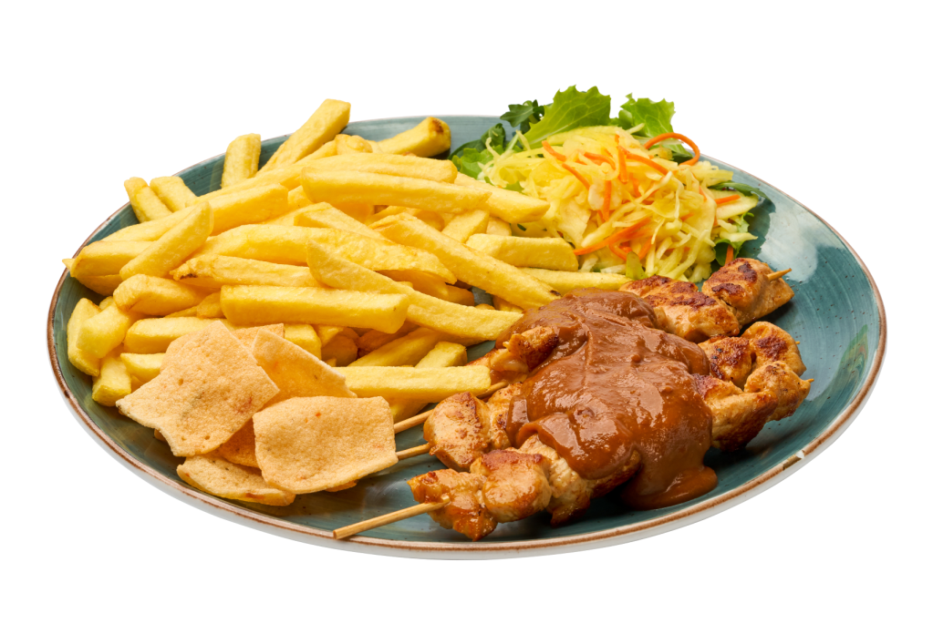 Drie huisgemaakte stokjes saté in saté saus met friet