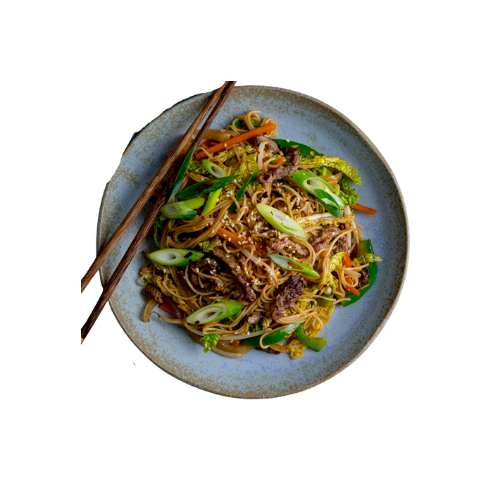 Beef met diverse groentes in huisgemaakte teriyaki saus.