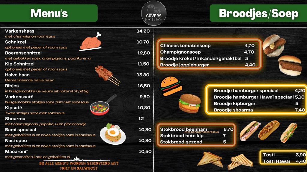 Frites | Snacks | Wok menu’s | Menu’s en Broodjes |ijs en milkshakes | Inspiratie